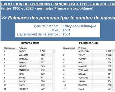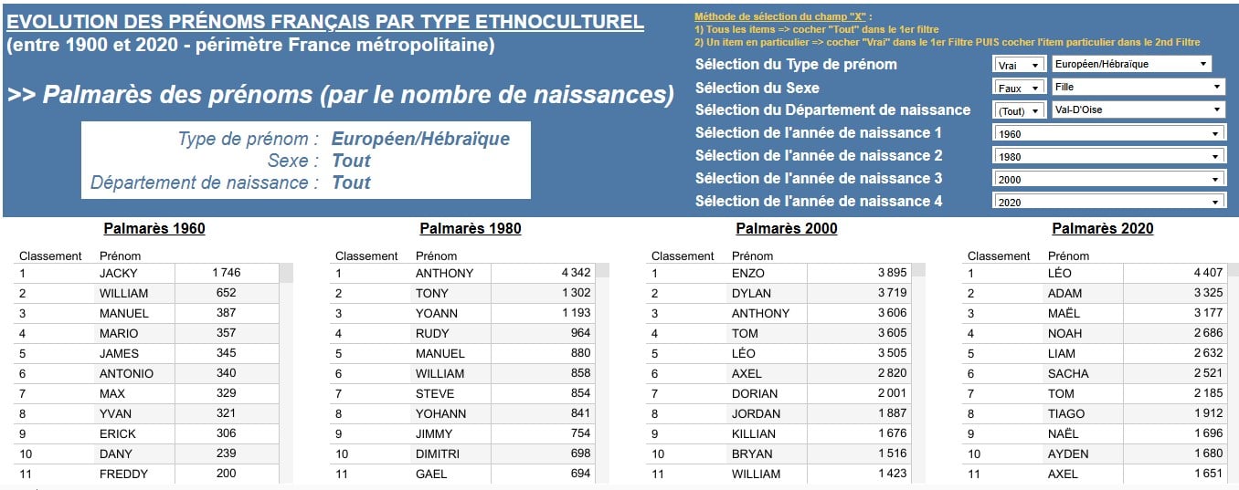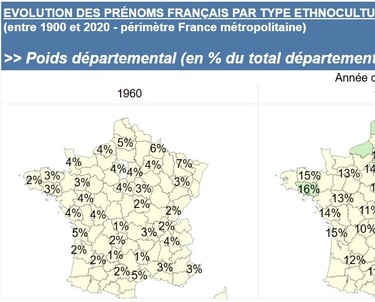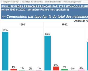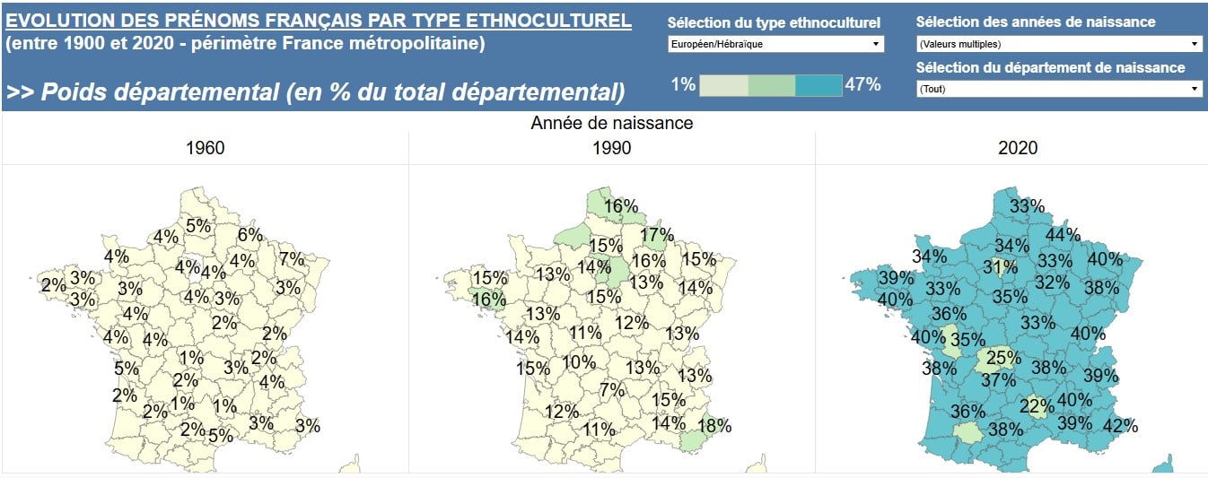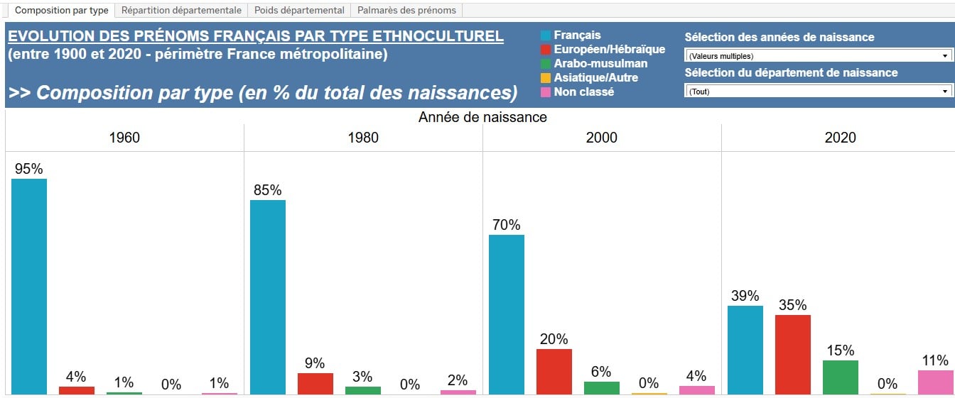 I have developed a Tableau tool to analyse the evolution of the first names given to the new borns in France from 1900 to 2020 with a focus per department, per gender and per ethnic origins. Thanks to this analysis we get interesting insights into the demographic and socio-cultural evolution of France since 1900.