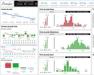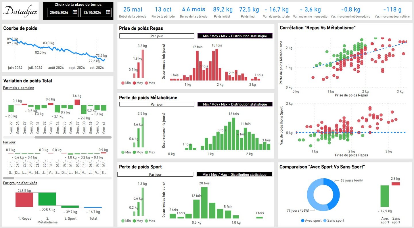 I have developed a Power BI tool to analyse my daily weight loss along a couple of months to understand my metabolism and test strategies to optimize my weight loss. Thanks to this analyse, I found how to lose 6 kg per month without having to starve myself and make much sport. I plan to make Youtube tutorials to share my experience and help people to lose weight by replicating my methodology based on my Power BI monitoring tool.