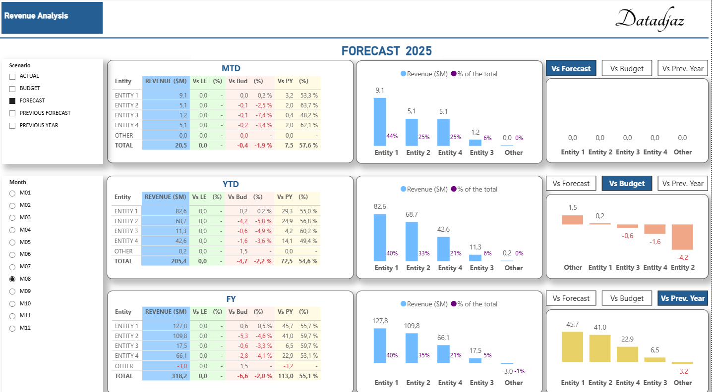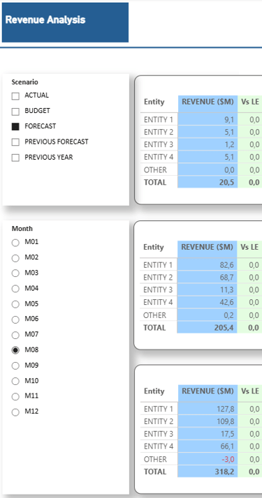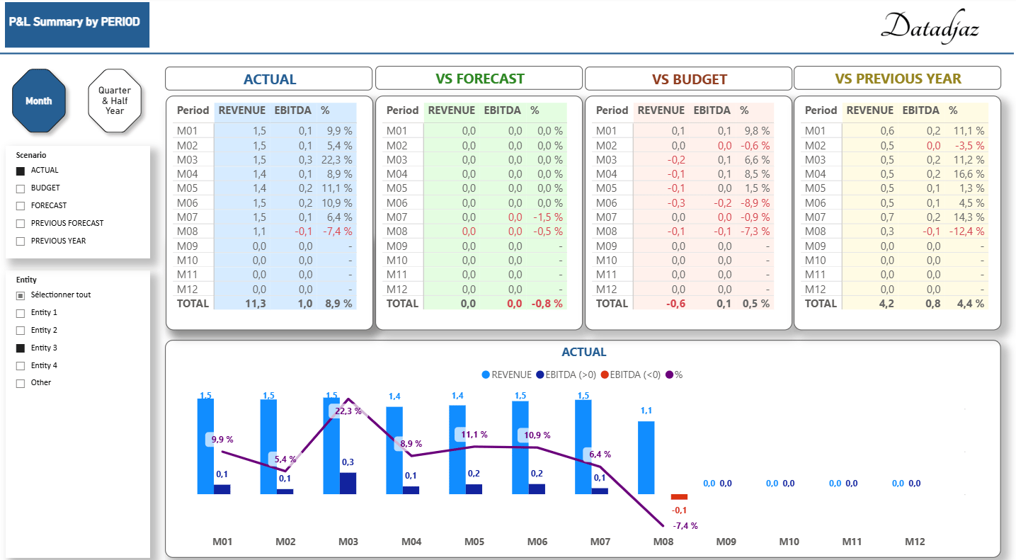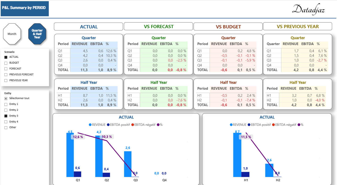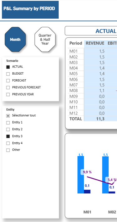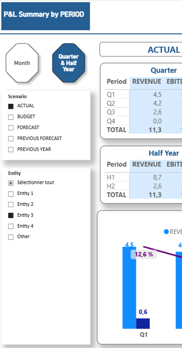 I have developed a Power BI tool that provides the high-level P&L follow-up of a company as part of the monthly financial reporting to the Top Management. The tool allows three axis of analysis : by scenario (ACTUAL, BUDGET, ...), by entity (Entity 1, Entity 2, ...) and by period with the option to display either a monthly view (M1, M2, ...) or a quarterly (Q1, Q2, ...) and half year view (H1, H2). Regarding the yearly cumulative results, the tool provides both the Year To Date and the Full Year results.